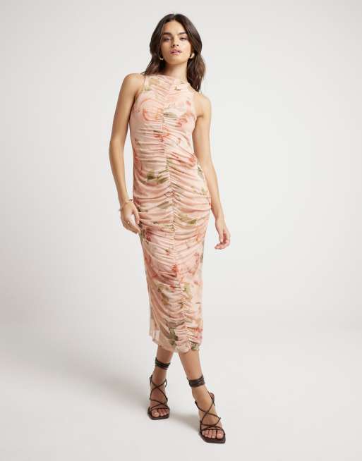River Island Mesh floral ruched bodycon midi dress in beige - light