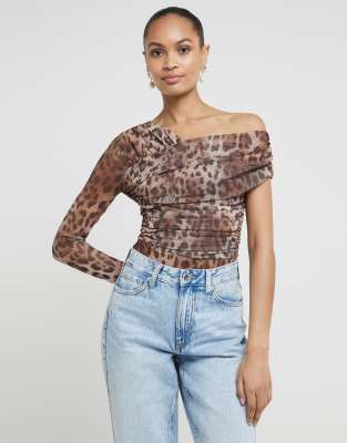 River Island Mesh leopard print asymmetric bodysuit in brown