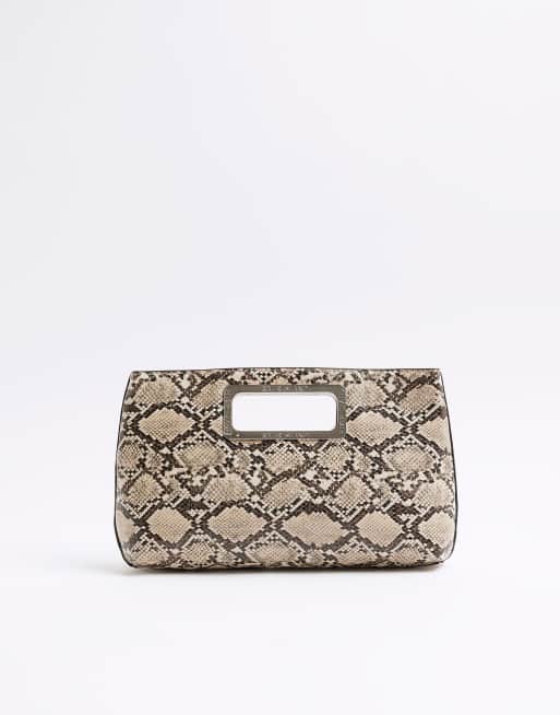 River Island Metal handle snake print clutch bag in beige