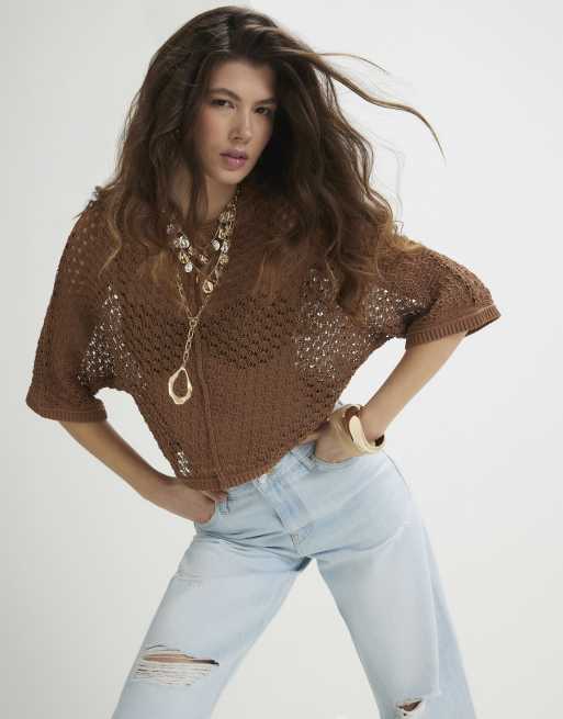 River Island Open stitch knitted t-shirt in brown