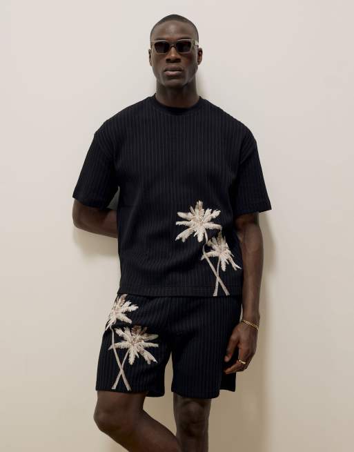 River Island Oversized plisse palm tee t-shirt in black