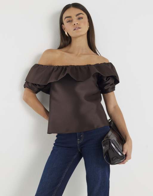 River Island Premium frill detail bardot top in brown