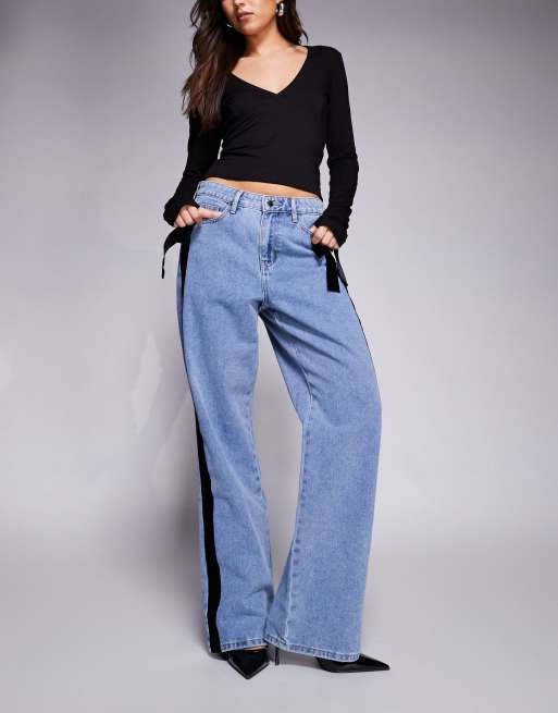 River Island relaxed straight jean with velvet bow detail in midwash blue