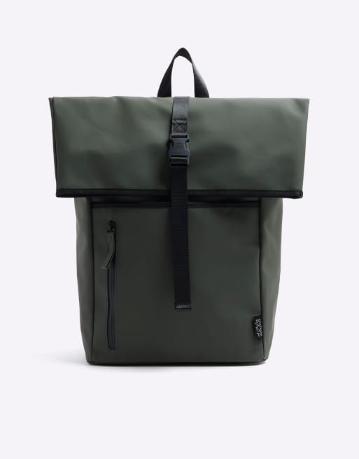 River Island Rubberised roll top backpack in khaki