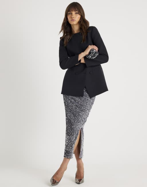 River Island Ruched side velvet sequin midi skirt in silver
