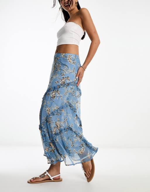 River Island ruffled tiered midi skirt in blue floral