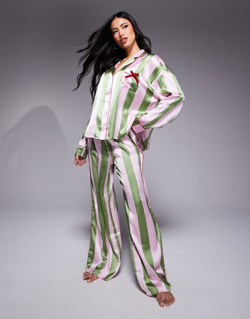 River Island satin pyjama set in green and pink stripe