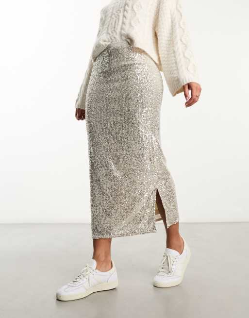 River Island Sequin midi skirt in silver