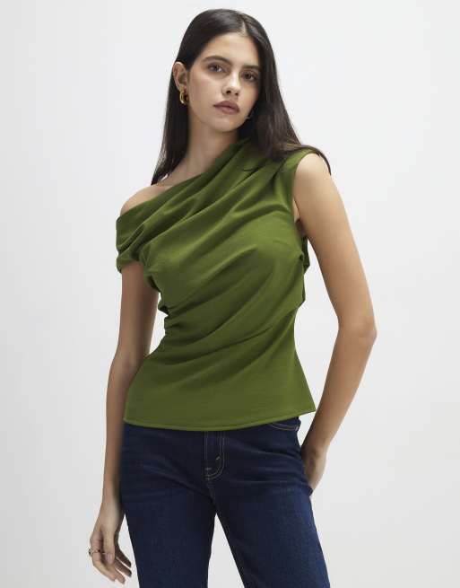 River Island Short sleeve drape off shoulder top in khaki