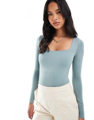 River Island square neck bodysuit with long sleeve in green