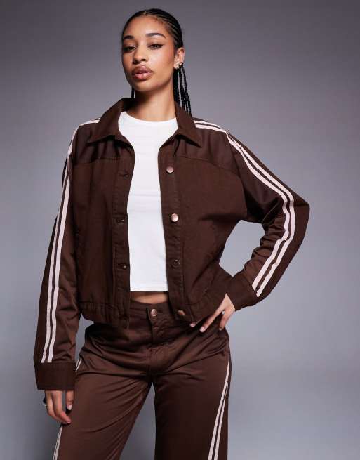 River Island striped detail denim jacket in dark brown