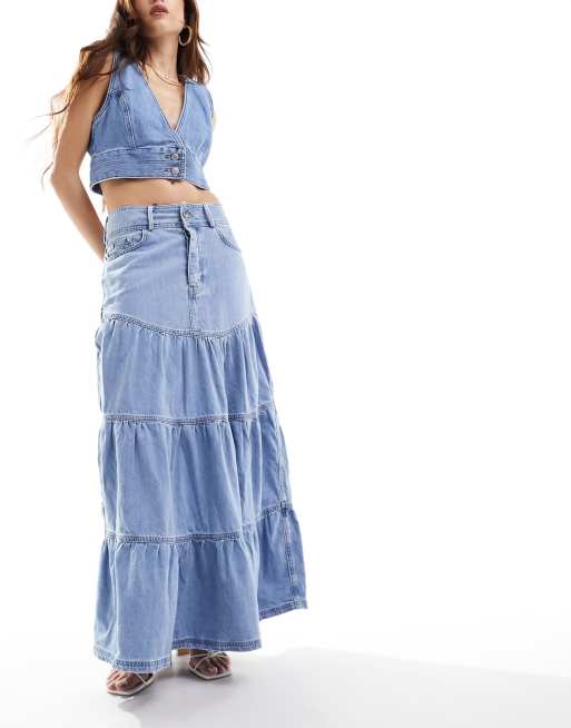 River Island tiered midi skirt in light denim