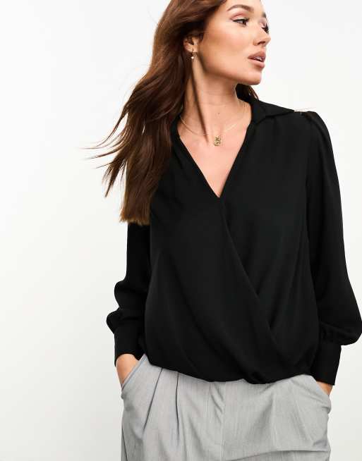 River Island V Neck Wrap Blouse in Black