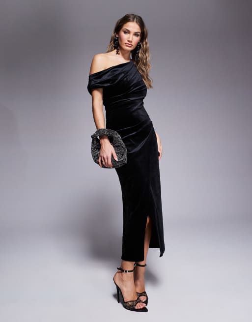 River Island velvet asymmetric midi dress in black