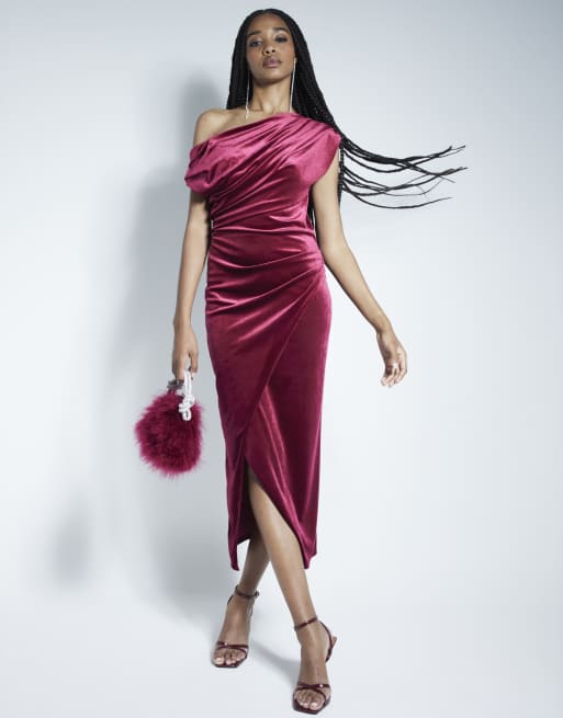 River Island Velvet drape off shoulder column dress in red - dark