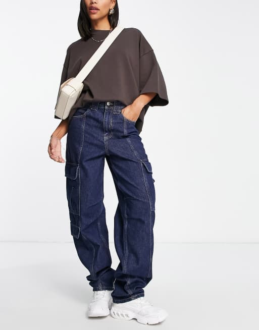 River Island wide leg cargo denim jean in dark blue