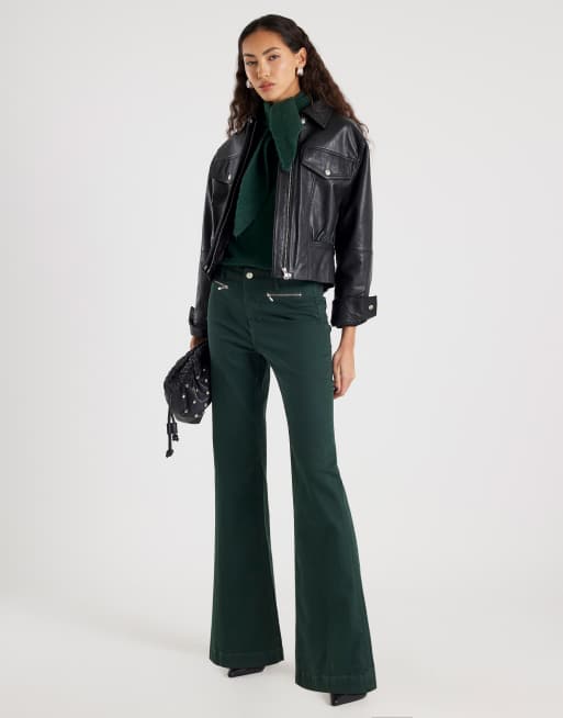 River Island Zip front relaxed flare jeans in green - dark
