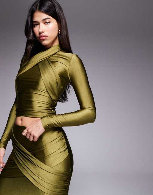 Ruched & Ready Looked Twice sculpted high shine halterneck drape front top co-ord in olive