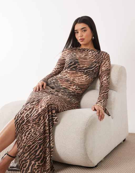 Ruched & Ready mesh flared long sleeve maxi dress in leopard print