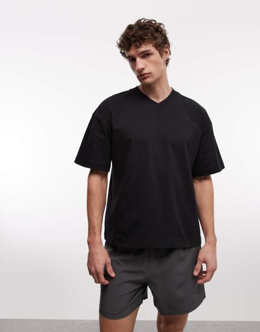 4505 – Svart, kraftig, boxig t-shirt i snabbtorkande bomull med sänkt axelsöm och v-ringning