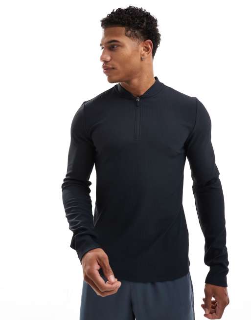 4505 – Training – Svart, långärmad, ribbad träningstopp med kvartslång dragkedja och smal passform