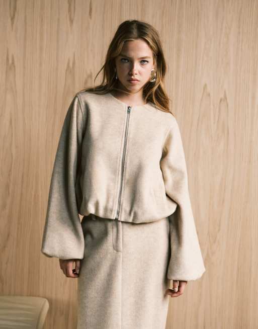 4th & Reckless – Beige bomberjacka utan krage med yllekänsla och ballongärmar, del av set
