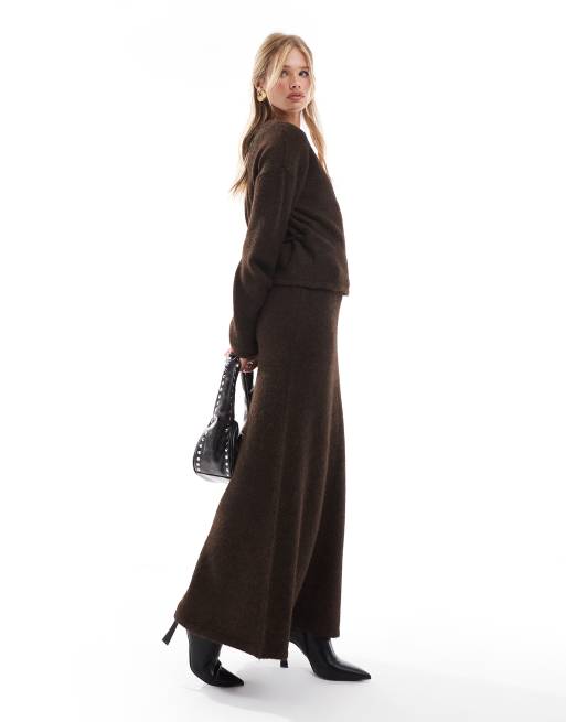 4th & Reckless – Chokladbrun, fluffigt stickad maxikjol i ullmix, del av set