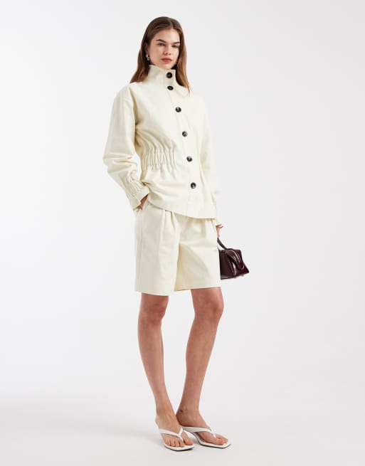 4th & Reckless – Krämvitt set i bomull med jacka med ståkrage, smockad midja och knäppning och shorts