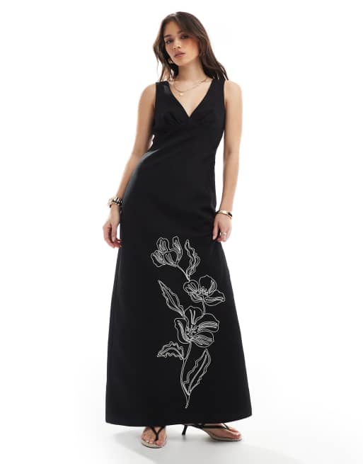 4th & Reckless – Svart maxiklänning i linnestil med v-ringning och broderade blommor