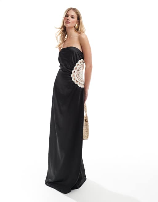 4th & Reckless – Svart maxiklänning i satin och bandeaustil med virkat inslag