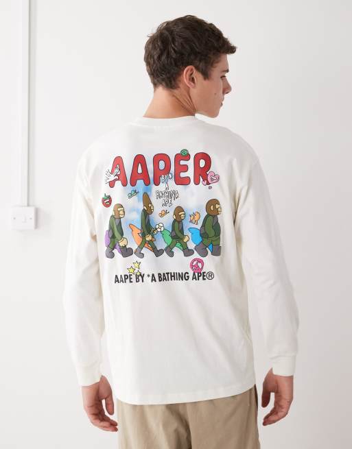 Aape By A Bathing Ape – Naturvit t-shirt med långa ärmar, boxig passform och promenadtryck baktill