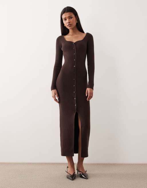 Abercrombie & Fitch – Brun, figursydd maxiklänning med långa ärmar och v-ringning