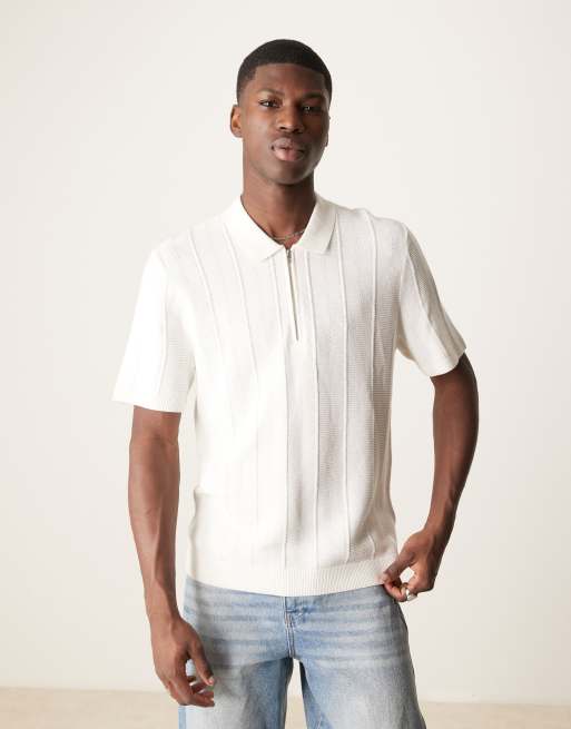Abercrombie & Fitch – Gräddvit, stickad pikétröja med korta ärmar och kort dragkedja