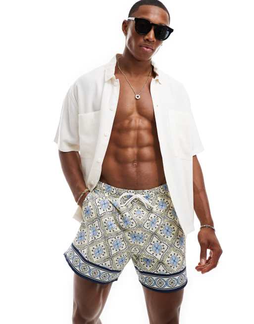 Abercrombie & Fitch – Gula, kakelmönstrade badshorts i dra på-stil på 5 tum