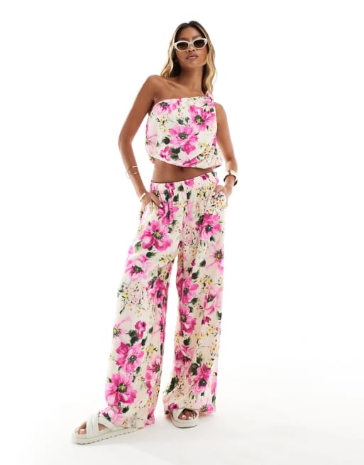 Abercrombie & Fitch – Rosa, blommiga, krinklade byxor med vida ben, del av set