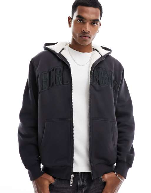 Abercrombie & Fitch – Svart, tvättad huvtröja i oversize med dragkedja, logga på bröstet och foder i fårskinnsimitation