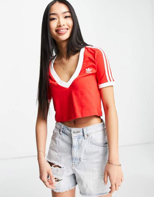 adidas Originals – adicolour – Röd crop top med v-ringning och 3 ränder