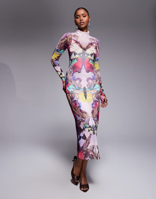 AFRM – Shailene – Lila, utsmyckad midiklänning i mesh med långa ärmar och halvpolokrage