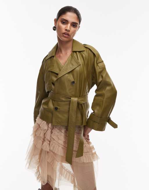 AllSaints – Reed – Kakifärgad jacka i läder med skärp