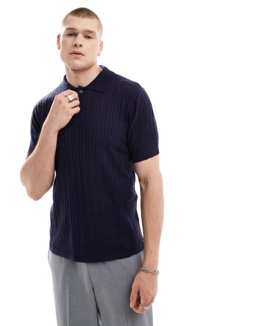Another Influence – Marinblå, kabelstickad pikétröja med knappar
