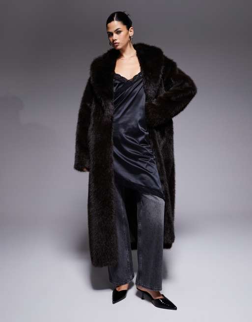 Aria Cove – Chokladbrun maxijacka i oversized fit och fuskpäls med krage