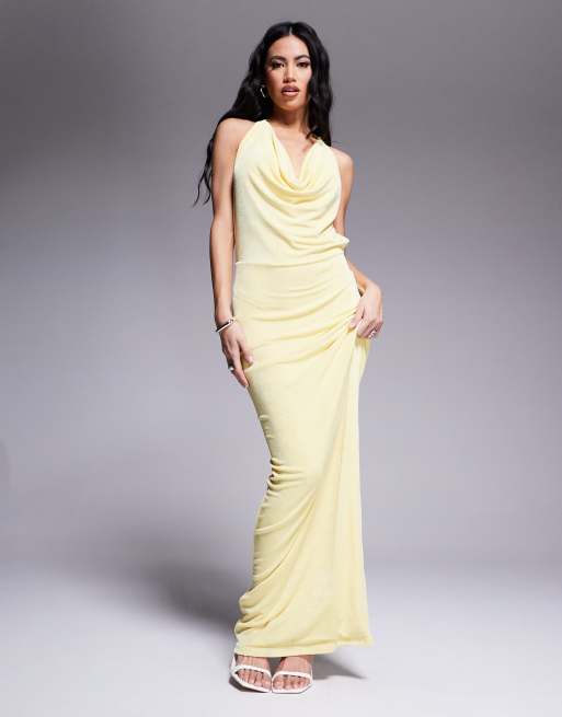 Aria Cove – Gul, åtsmitande maxiklänning i dubbla lager med djup, draperad ringning, öppen rygg och knytband