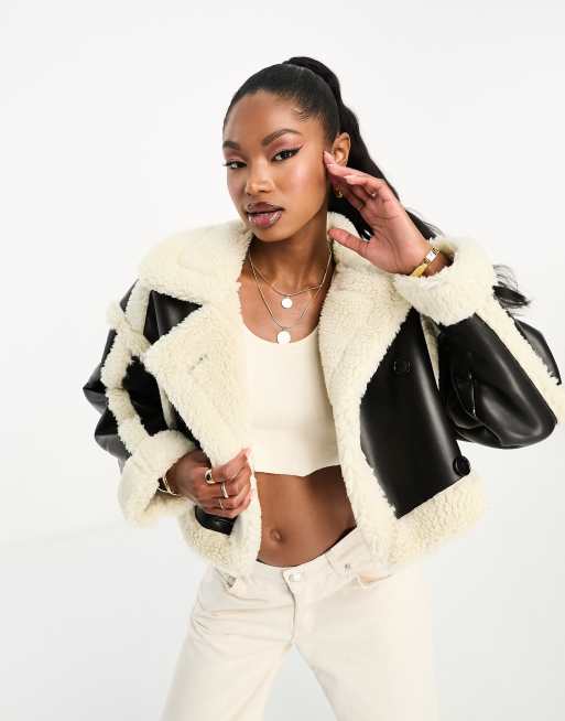 Aria Cove – Svart, gräddvit och kort kappa i fårskinnsimitation och konstläder