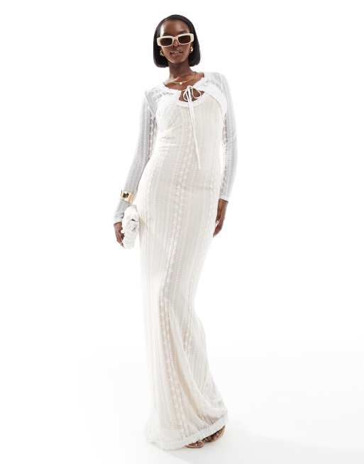 Aria Cove – Vit, pointellestickad maxiklänning med kort kofta