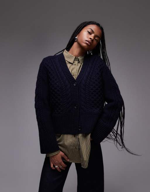 ARKET – Marinblå, kabelstickad kofta med v-ringning och knappar framtill