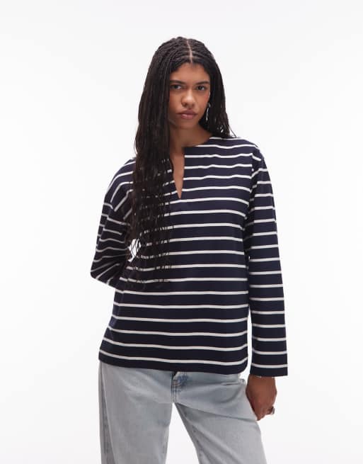 ARKET – Marinblå och vitrandig t-shirt i jersey och oversize med långa ärmar, öppen v-ringning och slits