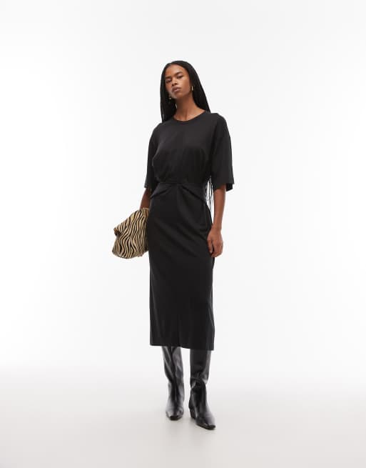 ARKET – Svart midaxiklänning i bomullsmix med halvlånga ärmar och knytning i midjan