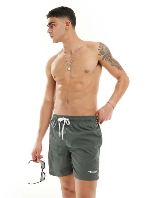 Armani Exchange – Mörkgrå badshorts med linjär logga och kontrastfärgad kantrand