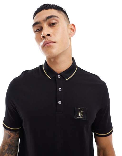 Armani Exchange – Svart pikétröja med guldlogga och kantrand