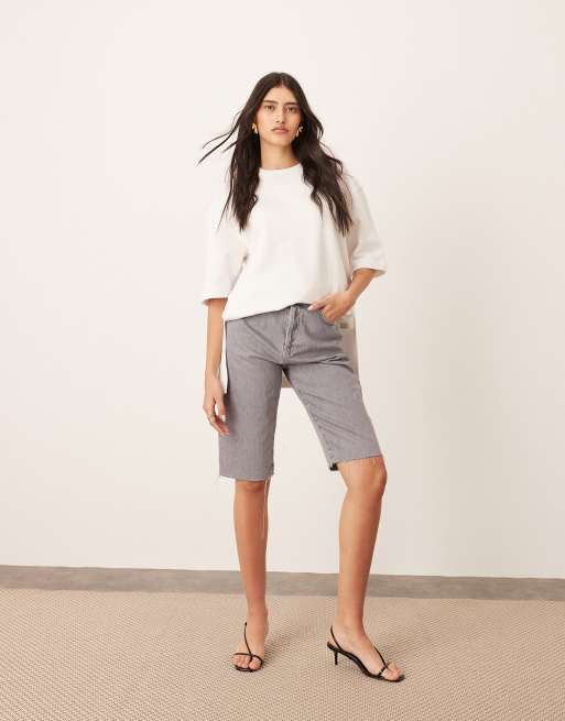 ARRANGE – Cleo – Skiffergrå jeansshorts i lång modell med rå fåll
